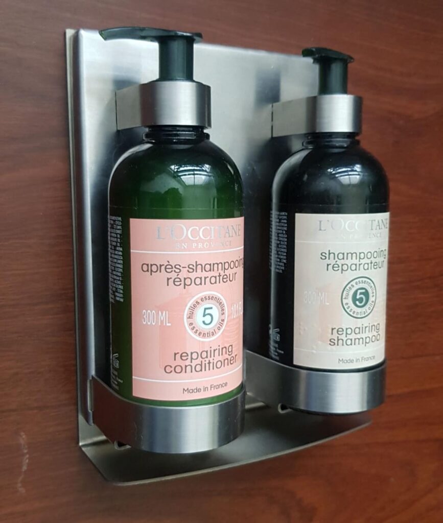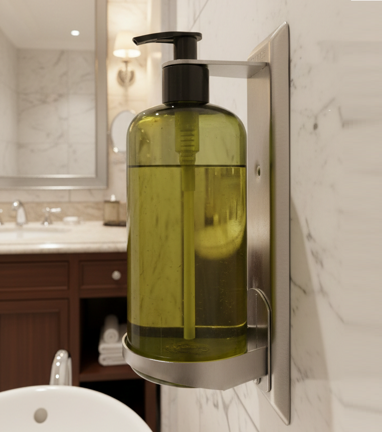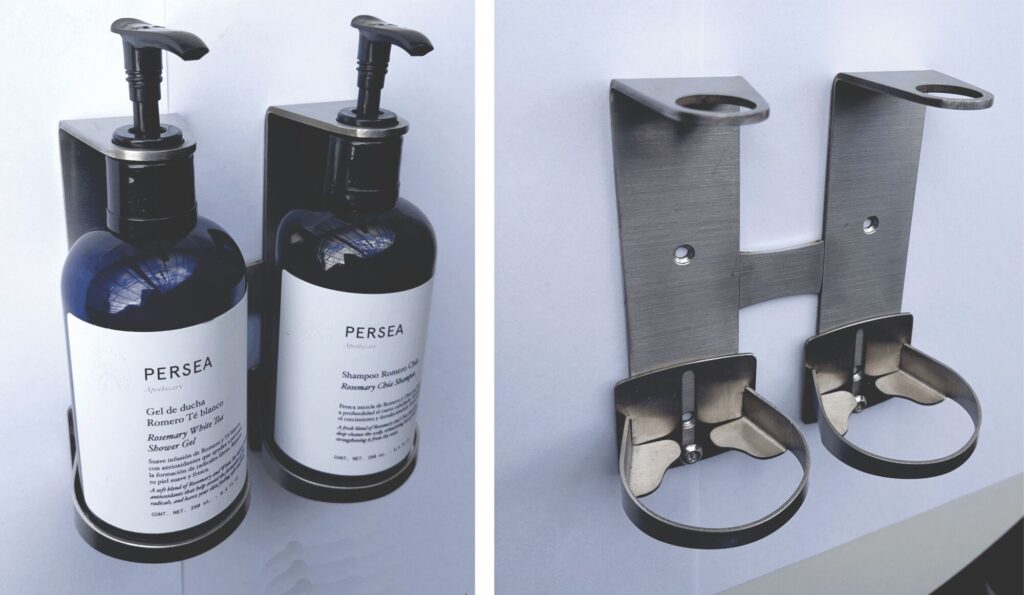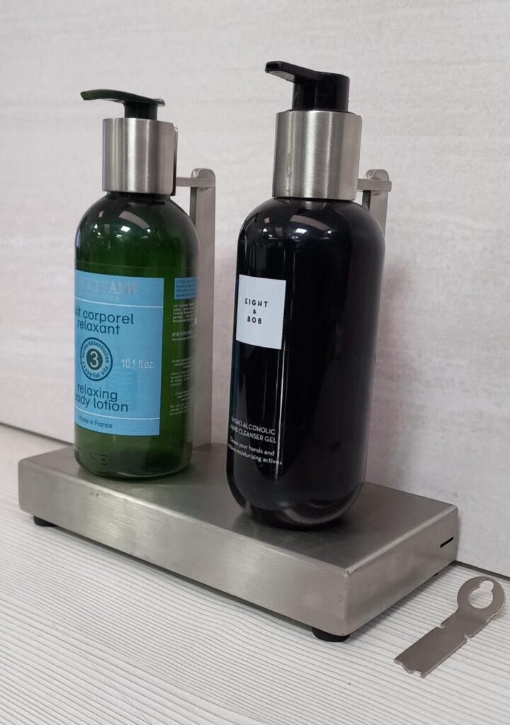 - Cada soporte está diseñado en acero inoxidable y cuenta con sistemas antirrobo, mecanismos de protección contra la contaminación, llave de seguridad y un diseño moderno que realza la presentación de los amenities, alineándolos con los estándares de la hospitalidad premium.